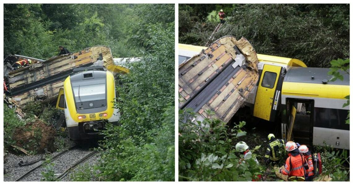 На кадрах с места аварии, появившихся в СМИ, видны поваленные деревья и несколько сошедших с рельсов вагонов, один из которых упал набок. По сообщениям немецких изданий, в поезде находилось около 100 человек. Из них по меньшей мере трое погибли, в том числе машинист и еще один сотрудник железнодорожной компании.