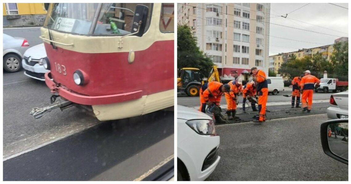 С пассажирами всё нормально. Там же ровная поверхность была – трамвай съехал с колеи на асфальт. Он на поворот входил, и ребро колеса вышло на асфальт – съехала вся тележка. Назад чуть-чуть оттянули и поставили на рельсы. Потом продолбили асфальт», — сообщили в мэрии города.