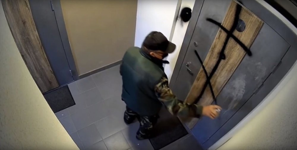 На опубликованных кадрах видно, как гражданин заливает краской из баллончика дверной звонок, а также рисует черный крест. После такого странного действа он обливает все вокруг легковоспламеняющейся жидкостью и устраивает пожар.