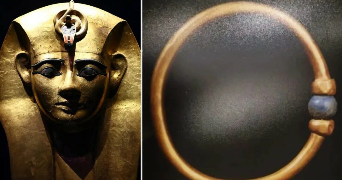 Украшение изготовлено из золота и украшено бусиной из лазурита — некогда редкого драгоценного камня глубокого синего цвета, часто с золотыми вкраплениями.