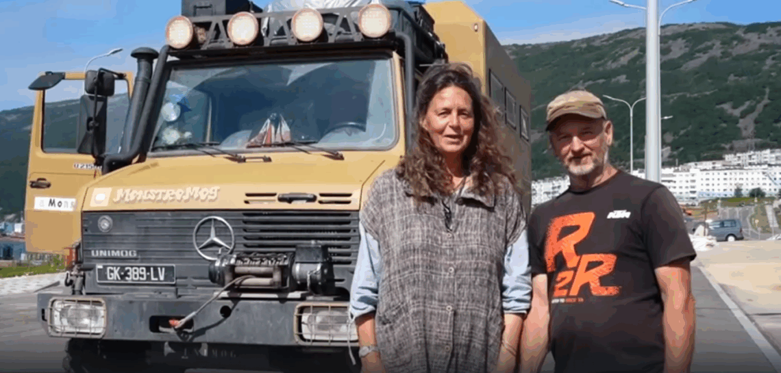 Их вездеход-монстр — это не просто транспорт, а настоящий дом: 500 литров воды, душ внутри и снаружи, а компанию им составляют два верных пса! �🐕 Благодаря 16 скоростям и мощному двигателю они легко преодолели тысячи километров, чтобы увидеть суровую, но потрясающую красоту России.