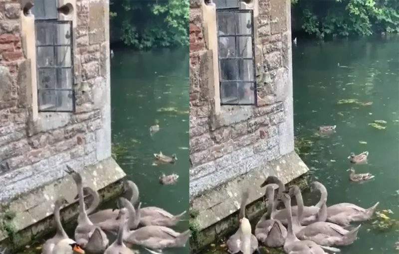Лебеди звонят в колокол, чтобы получить еду