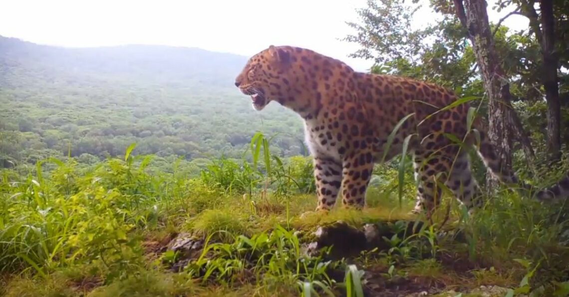На видео заметно, как большая дикая кошка удобно устраивается в месте с живописным видом. Леопард осматривает свои «охотничьи владения» — леса и сопки вдалеке и затем ложится на зеленую траву.