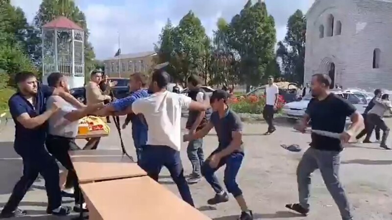 Предположительно, две конфликтующие группы встретились у храма на освящении яблок. На кадрах с места инцидента заметно, как между несколькими мужчинами разгорается словесная перепалка.
