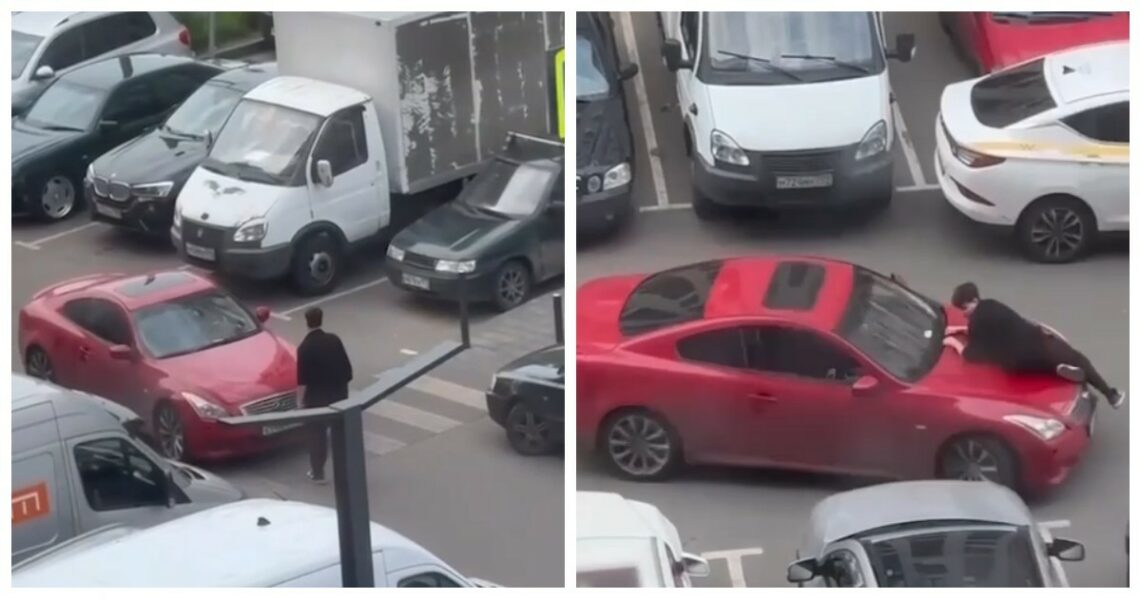 На видео запечатлено, как девушка на красной машине задела капотом своего бывшего парня, который перегородил ей дорогу. Тот сначала пытался остановить движущуюся машину, а затем забрался на нее.