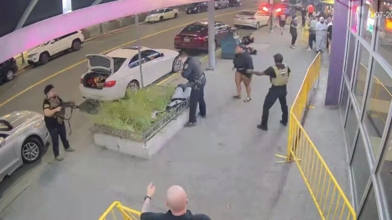Его доводам никто не поверил, а вот угрозы охранники приняли всерьез и вызвали подкрепление. Когда молодой человек потерял веру в силу слова (с 00:48) и принялся палить в собеседника из пистолета, его тут же уложили из полуавтоматической винтовки.