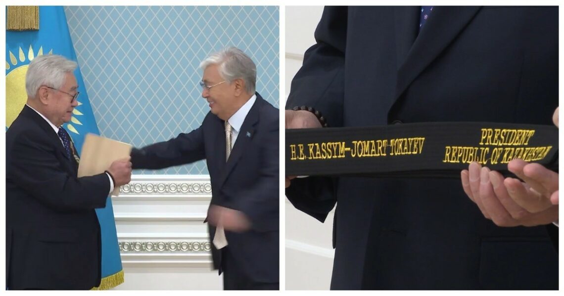 Президент Казахстана Касым-Жомарт Токаев получил из рук главы Всемирной федерации таеквондо (WT) Чунгвон Чоу чёрный пояс девятого дана, а затем по традиции разбил кулаком тренировочную доску со своим автографом.