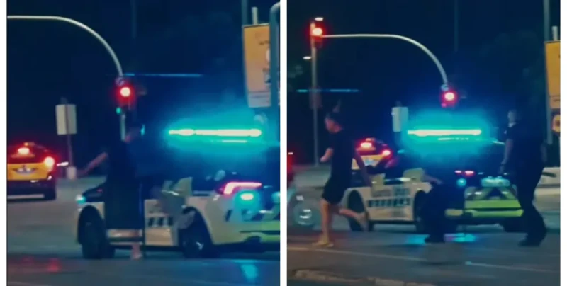 Ролик с курьезным преследованием стал вирусным — набрал более 14 млн просмотров. На видео видно, как в три часа ночи 27 июня неизвестный турист посреди Барселоны навеселе подходит к полицейскому авто и, похоже, бьет заднюю дверь. Затем он гордо отходит, пока два офицера выскакивают из машины с дубинками в руках.