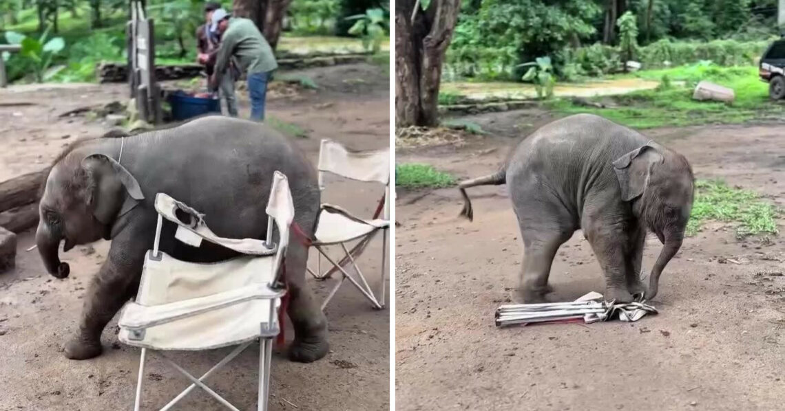 Малыша из тайского приюта для слонов Tusker Shelter застали с поличным: он решил сесть на складной стул, где обычно отдыхает его кипер. Мирин попытался поднять ноги, чтобы влезть на стульчик, но уронил его. Слоненок расстроился и начал тыкать непослушный стул хоботом, чтобы тот снова раскрылся.