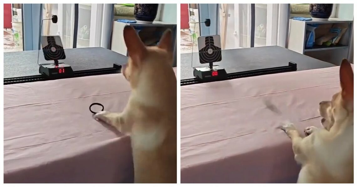 Хозяин обучил собаку редкому трюку: питомец научился стрелять резинками. Видео показывает, как животное аккуратно выполняет задачу, демонстрируя отличную реакцию и координацию движений.