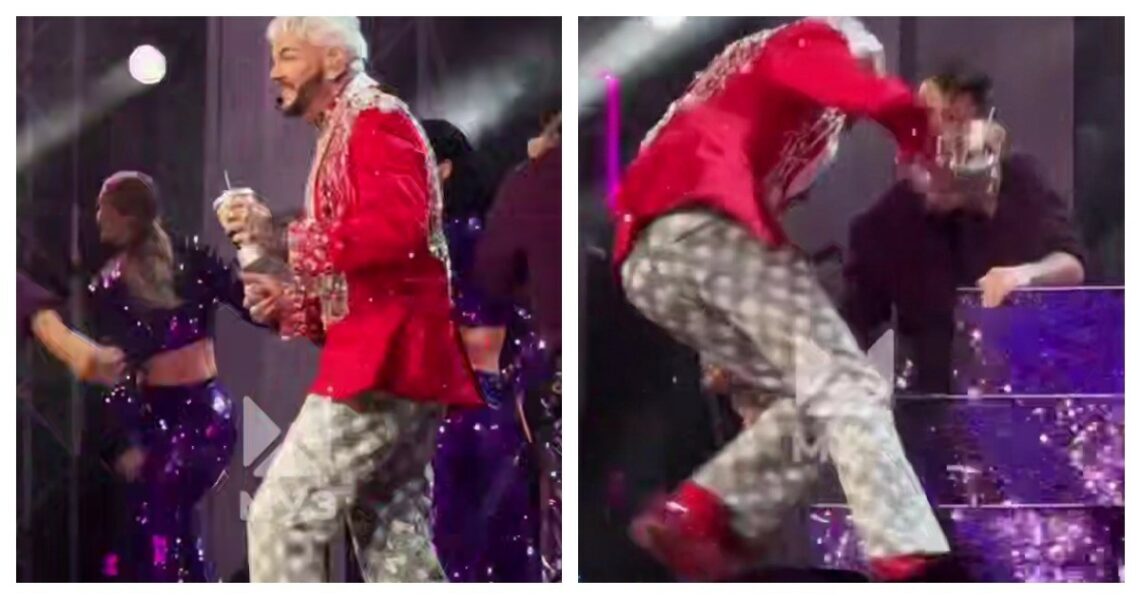 Когда Филипп Киркоров ступил на декорацию в виде блестящей фиолетовой лестницы, то поскользнулся и рухнул. Певец после этого, как ни в чем не бывало, продолжил выступление.