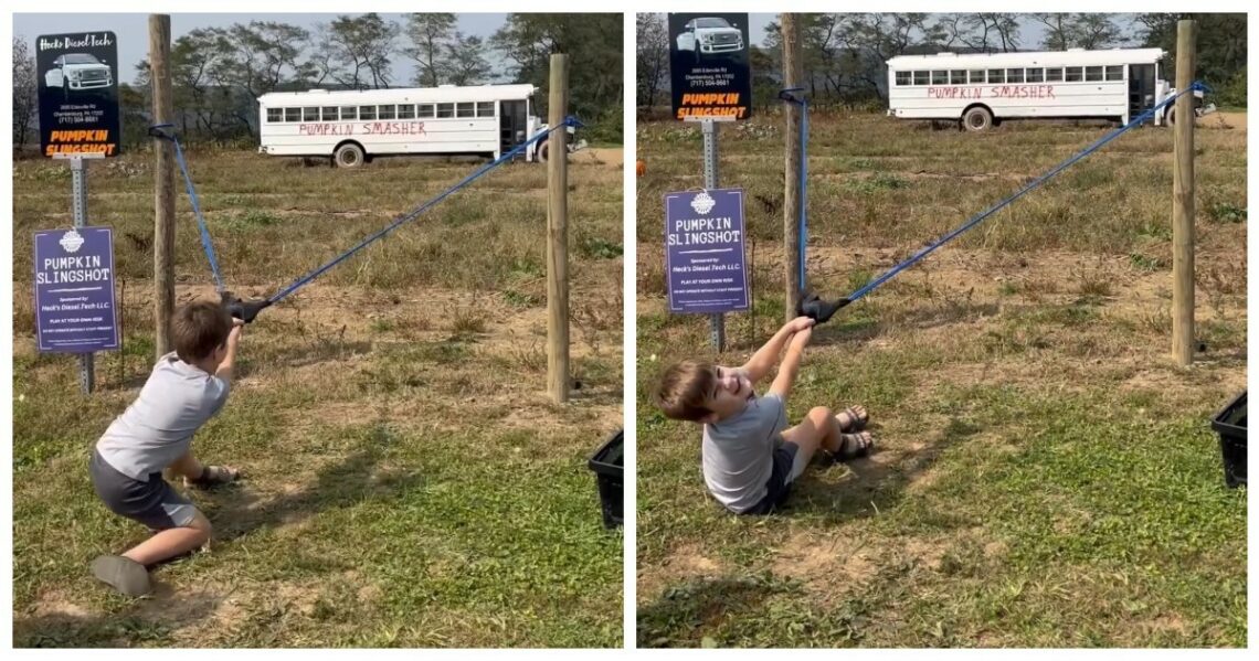 Решив испытать большую рогатку, мальчик запустил тыкву, но эксперимент пошёл не по плану: снаряд отлетел прямо ему в лоб.