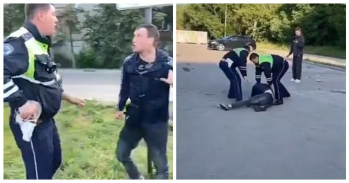 Полицейские вдвоем попытались задержать агрессора и повалили его на землю. Затем один из них поволок молодого человека к патрульному автомобилю.