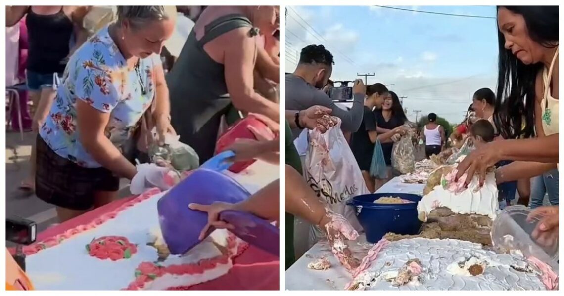 Организаторы почему-то решили, что бразильцы справятся без столовых приборов. Спустя минуту: толпа «яжматерей» и отцов с тазами буквально вгрызалась в торт — рвали коржи, сгребали крем, кто-то даже утаскивал куски целыми метрами.