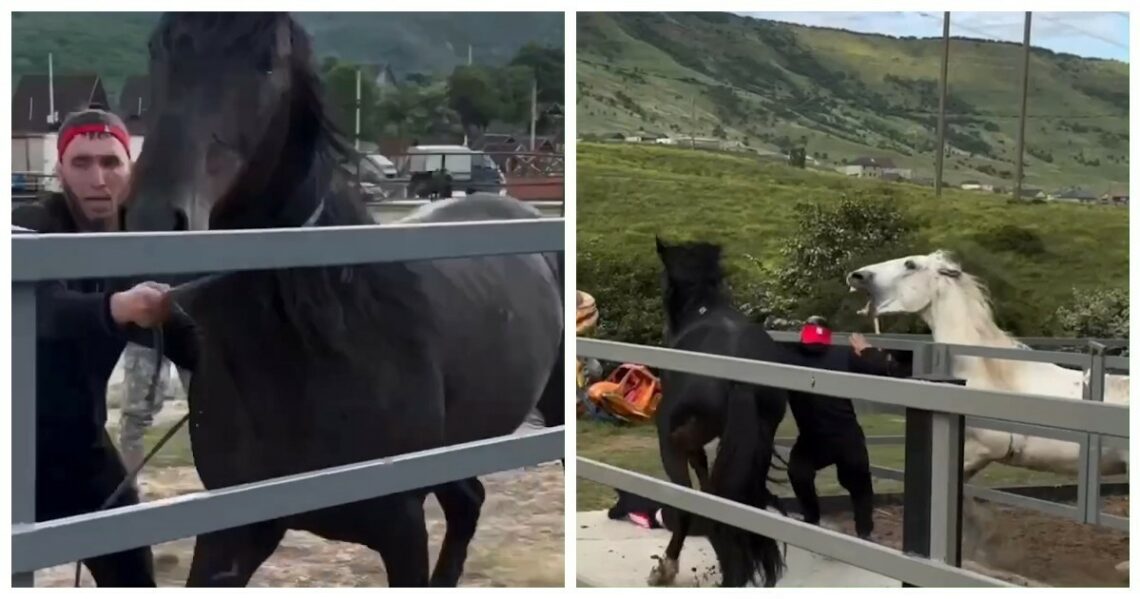 Матерь-природа не устает напоминать забывчивым людям, что животные — братья меньшие, и с ними надо обращаться соответственно. Один не в меру темпераментный жокей в горах Дагестана решил воспитывать коня ногами — и едва не поплатился. На манеже выступали 2 скакуна — черный и белый. Первые были недовольны, и наездник вздумал учить его смирению ударами ног.