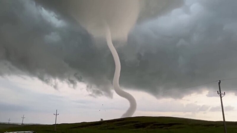 Сначала один торнадо рассеялся, и прямо за ним тут же сформировался новый смерч, после чего из-за резких порывов ветра воронка зрелищно извивалась прямо под основанием грозовой тучи.