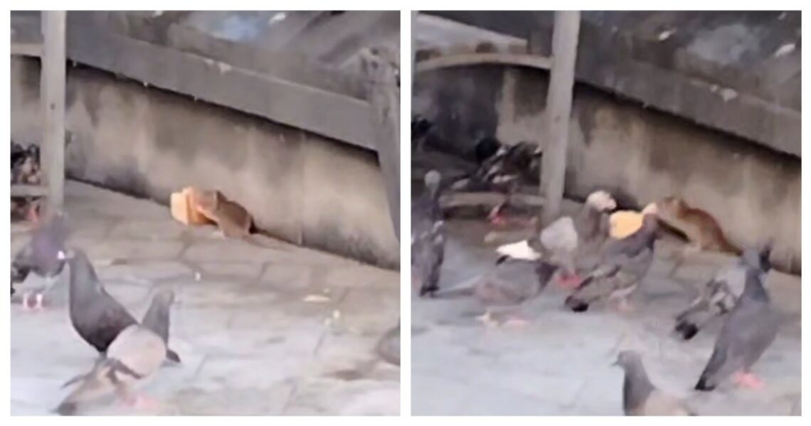 На записи видно голубиную стаю, которая борется за хлеб с крысой. В этот момент две птицы подходят ближе к грызуну и пытаются отбить его горбушку. Птичьей «банде» даже посчастливилось отхватить хлеб и поклевать, но не надолго. Уже вскоре крыса, отважно сопротивляясь, дает им отпор и покидает место с добычей.