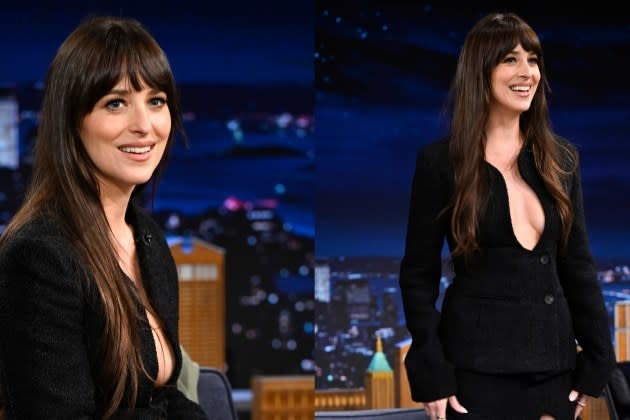 35-летняя звезда фильма «50 оттенков серого» появилась перед камерами в черном наряде, который состоял из приталенного жакета с глубоким фигурным декольте и мини-юбки. При этом артистка отказалась от бюстгальтера.
