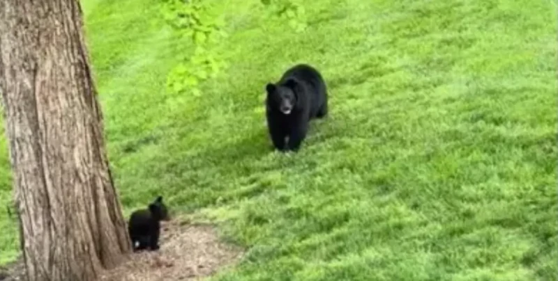 В кадре можно увидеть, как медведица и ее детеныши исследуют во дворе небольшой бассейн, наполненный водой. В описании отмечается: «Я купила маме-медведице и ее медвежатам бассейн». Зверьки заинтересованно ходят вокруг искусственного водоема, а затем направляются к дереву.