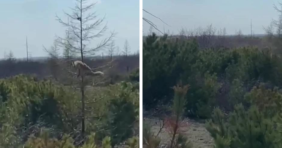 На Сахалине очевидец снял на видео лису, которая вскарабкалась за бурундуком на сухую ёлку