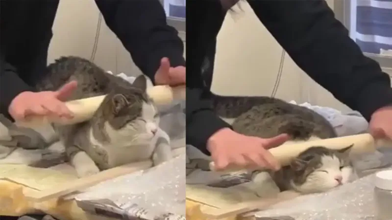 Котейка из этого видео, обнаруживший стол после приготовления теста, решил, что это новая зона для релаксации. Хозяйка, недолго думая, применила кухонную скалку не по назначению, превратив инструмент для теста в массажер для пушистого. Каждое движение скалки по спине кота сопровождалось блаженным прищуриванием.