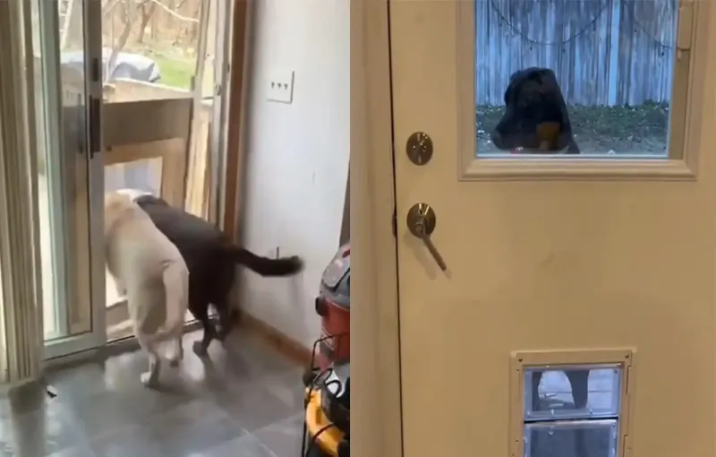 Одни псы, увидев унизительные, по их мнению, габариты прохода, с разбегу штурмуют их, не думая о последствиях. Другие, словно заглядывая в портал в параллельную вселенную, осторожно суют нос в отверстие, но так и не решаются сделать шаг. Ну, а третьи думают, что проходить в двери нужно только вместе с другом и никак иначе.