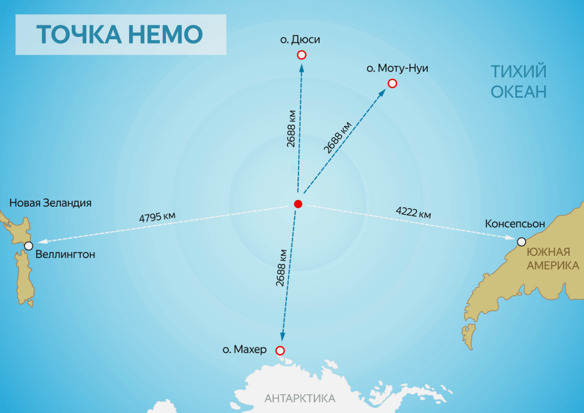 Точка Немо считается самым далеко расположенным от побережья местом на планете. До ближайшего участка суши — больше 2500 км. Точкой её называют скорее условно, на самом деле это участок, который занимает около 37 млн м². Чтобы был понятен масштаб, стоит сказать, что это примерно как две России.
