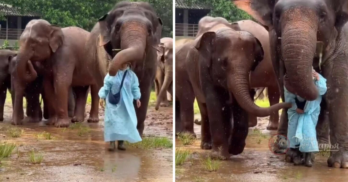 Эта сцена, полная нежности и преданности, произошла в Таиланде. Слоны, живущие под опекой смотрительницы, продемонстрировали свою привязанность необычным способом. Внезапный ливень не застал их врасплох, и они инстинктивно защитили свою покровительницу.