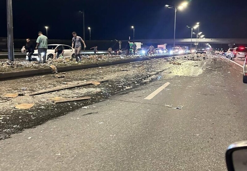 Инцидент произошел у развязки, ведущей в Боровое Матюшино. Затор образовался в обе стороны. Предположительно, пробка собирается из-за припаркованных на обочине машин. Водители останавливаются, чтобы подобрать сохранившиеся бутылки — их уносят десятками.