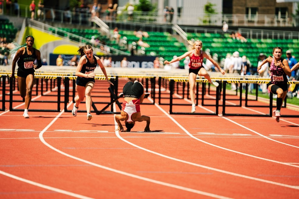 Бруклин Андерсон, бывшая гимнастка, имела хороший отрыв от соперниц, когда задела коленом барьер на последнем препятствии. Она бы не успела подняться, поэтому в падении сделала кувырки и всё равно закончила дистанцию первой. «Я не была уверена, насколько отстают от меня остальные. Я просто знала, что мне нужно продолжать двигаться, потому что я хотела оказаться первой», — сказала Андерсон. Андерсон закончила гонку за 14,93 секунды.