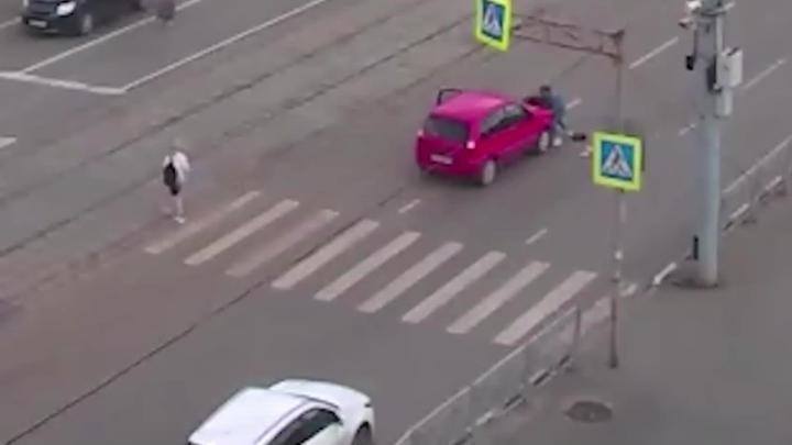 Водитель поворачивал налево и посадил на капот троих человек, включая 10-летнего ребенка. Спустя несколько секунд виновник сдал назад и поспешил уехать.