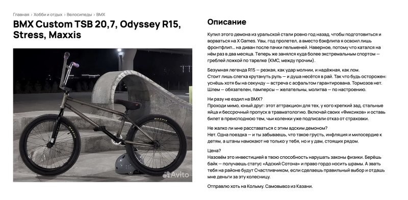 Купил этого демона из уральской стали ровно год назад, чтобы подготовиться и ворваться на X Games. Увы, год пролетел, а вместо бэкфлипа я освоил лишь фронтфлип… на диван после пачки пельменей. Наверное, потому что катался на нём раз в два месяца. Теперь же занялся куда более экстремальным спортом — греблей ложкой по тарелке (КМС, между прочим).