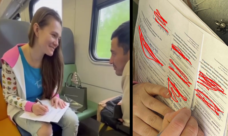 Девушка прямо в электричке заполняет за мигранта документы для постановки на учёт