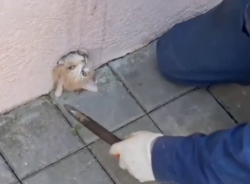 Первую минуту прохожие подумали, что животное погибло, но потом заметили, что усы шевелятся. На место вызвали спасателей. Спецслужбы прибыли с инструментами, расширили отверстие и освободили рыжего заложника. Как только кот оказался на свободе, он гордо ушёл в неизвестном направлении