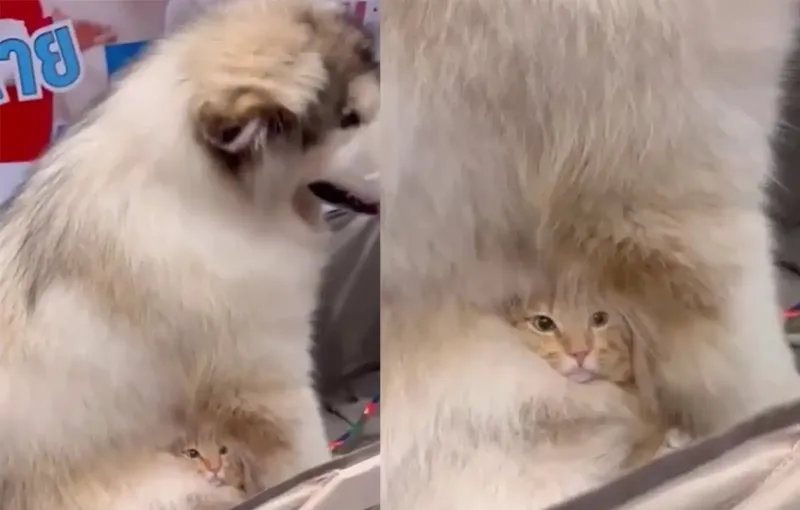 Всем порой хочется укрыться от мира в теплом и уютном уголке, и кот из этого видео явно нашел совершенное убежище — густую шерсть своего лохматого друга-пса. Котейка с наслаждением погрузился в пушистый океан, оставив снаружи лишь голову, которая излучает абсолютное удовлетворение. Пёс, в свою очередь, невозмутимый, как философ на прогулке, кажется, давно смирился с ролью живого пледа.