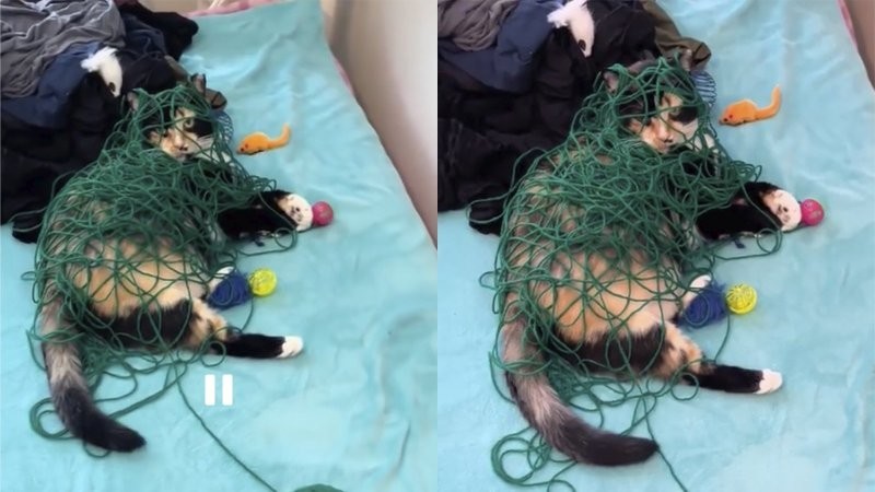 Питомец, похоже, сам решил стать клубком. Для этого он обмотался пряжей с ног до головы, торчал только хвост. К счастью, хозяйка вовремя заметила, чем занимается ее питомец.