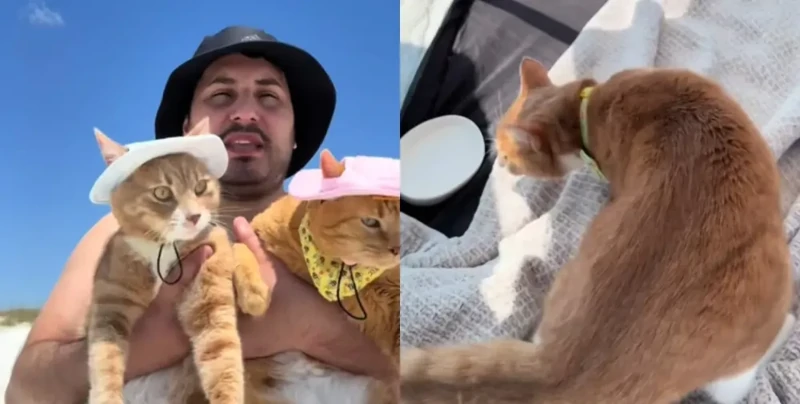 Оборудовав уютную палатку с водой, игрушками и лотком, мужчина дал своим питомцам возможность насладиться природой, не нарушая их привычного комфорта. После отдыха в тени, кошек аккуратно вынесли к воде — в шляпках от солнца, как настоящих курортников. По словам хозяина, Кэши была немного настороженной, а вот Алмонд с восторгом принялся исследовать песок и морской пейзаж.