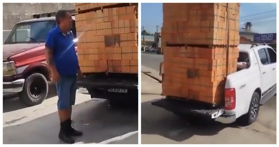 Мужчина приехал купить себе стройматериалов на склад. Работяги погрузили кирпичи в его мощный пикап. Но… закрепили они кирпичики довольно слабо. В итоге мужик проехал всего пару метров и… навалил.