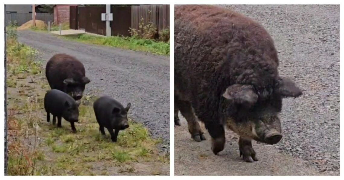 Хрюкающие ревизоры провели осмотр участка на окраине Сестрорецка. Пес по кличке Маршалл благоразумно решил не лезть на рожон, а понаблюдать за опасными гостями из укрытия.