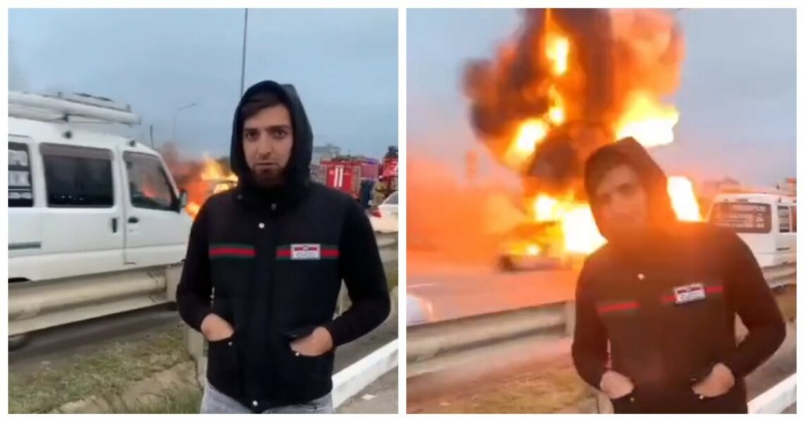 Машина взорвалась прямо за спиной у парня, который решил снять видос