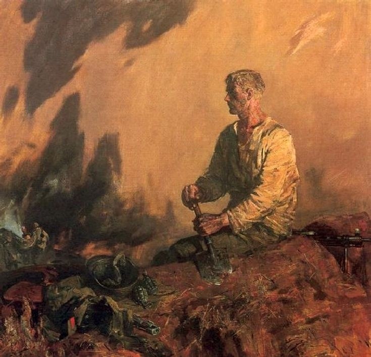 И все молчали. Молчали солдаты и офицеры, молчал генерал. Молчали бросившие работу женщины вдалеке, и охрана их тоже молчала, и все смотрели сейчас на эту фигуру, строгую и неподвижную, как памятник. Потом генерал что-то негромко сказал.