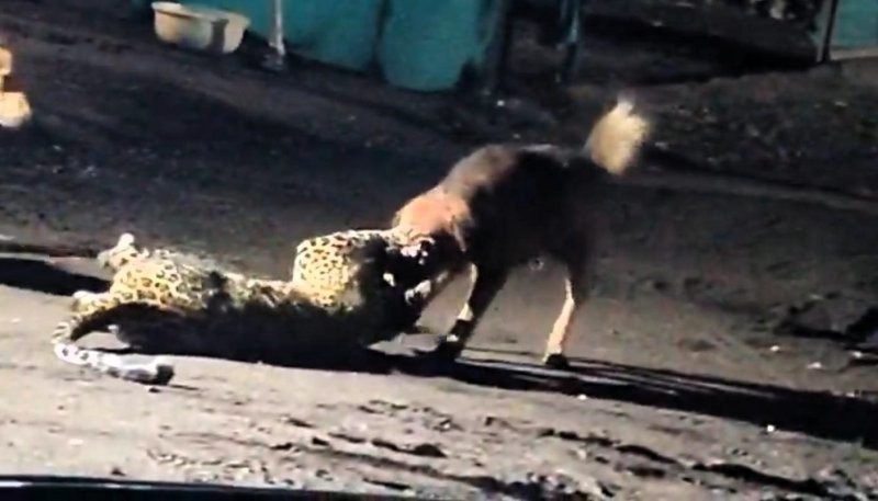 Животное, которое хищник облюбовал в качестве добычи, оказалось не робкого десятка. Несмотря на то, что нападение леопарда было жестоким и собака получила несколько ран, она предприняла контратаку, и вскоре уже большой дикий «кот» оказался жертвой — собака протащила его по улице примерно 300 метров.
