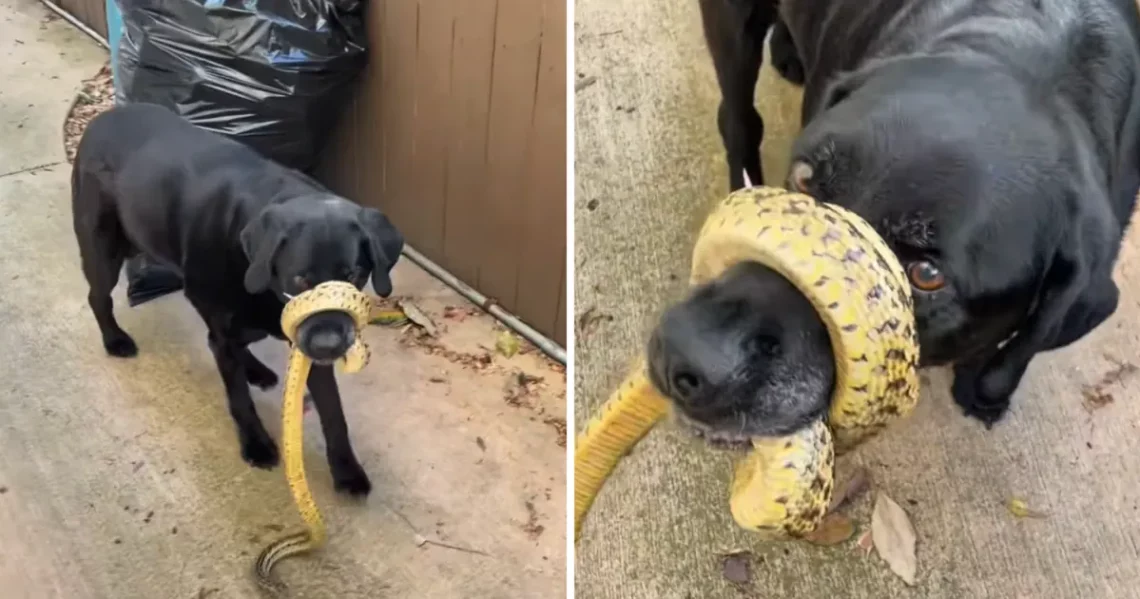 На кадрах, которые быстро разлетелись по Сети, видно, как шестилетняя Кейси стоит спокойно, пока рептилия плотно обвивает ее морду. Спасатель использовал несколько любимых лакомств собаки и ждал, пока Кейси отпустит змею. Рептилию, которая получила незначительные травмы, выпустили обратно в природу.