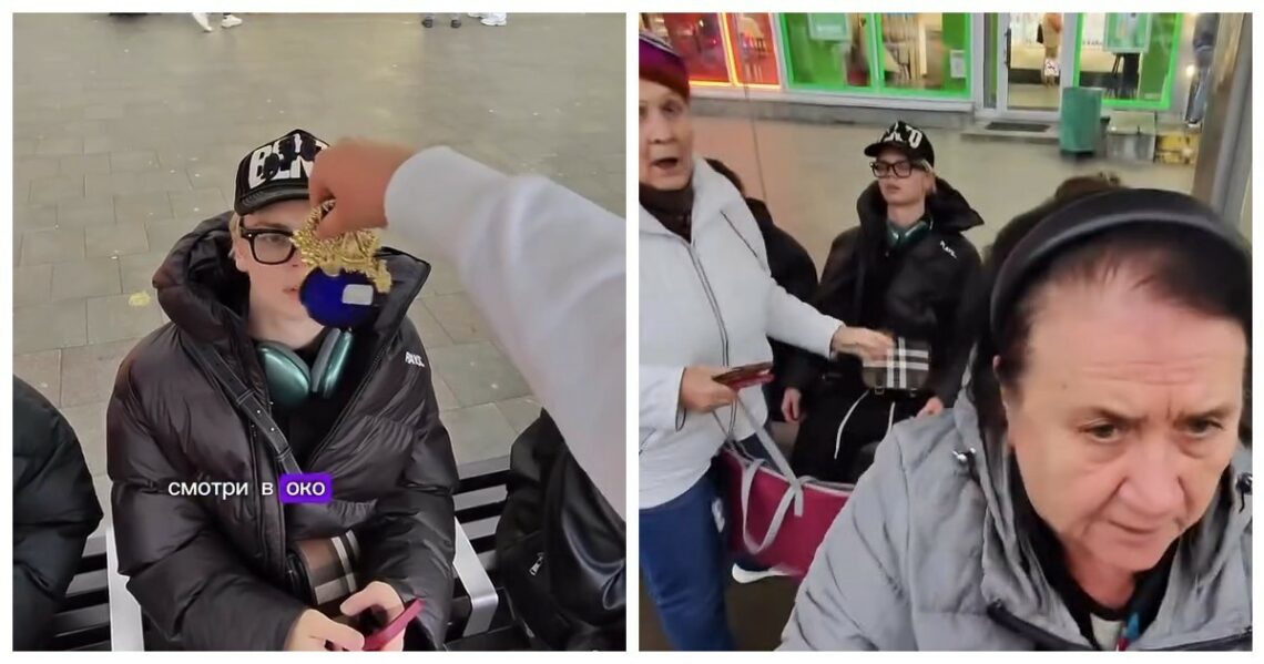 На остановке двое молодых людей решили разыграть сценку с «амулетом для гипноза», чтобы посмотреть на реакцию прохожих. Один из них «отключился» и попытался забрать телефон, ключи и кошелёк у другого. Наблюдавшие пожилые женщины вмешались, вернули вещи и помогли восстановить состояние «жертвы».