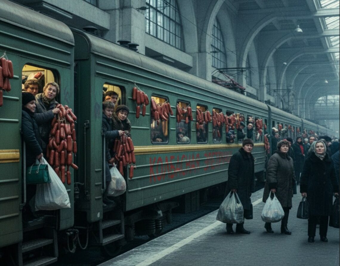 В 1980-х годах в Советском Союзе появилось явление, которое сегодня уже стало частью фольклора — «колбасные электрички». Так называли пригородные поезда, на которых жители Подмосковья, Ленинградской области и других регионов массово ездили за продуктами — в Москву или обратно. Эти электрички стали не просто средством передвижения, а символом эпохи дефицита и человеческой изобретательности.