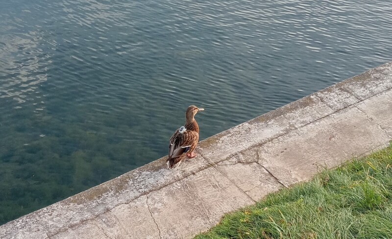 Мне удалось приблизиться к загадочной утке, прежде чем её группа поддержки стала проявлять беспокойство. При этом героиня сюжета вела себя очень спокойно, и никого не боялась.