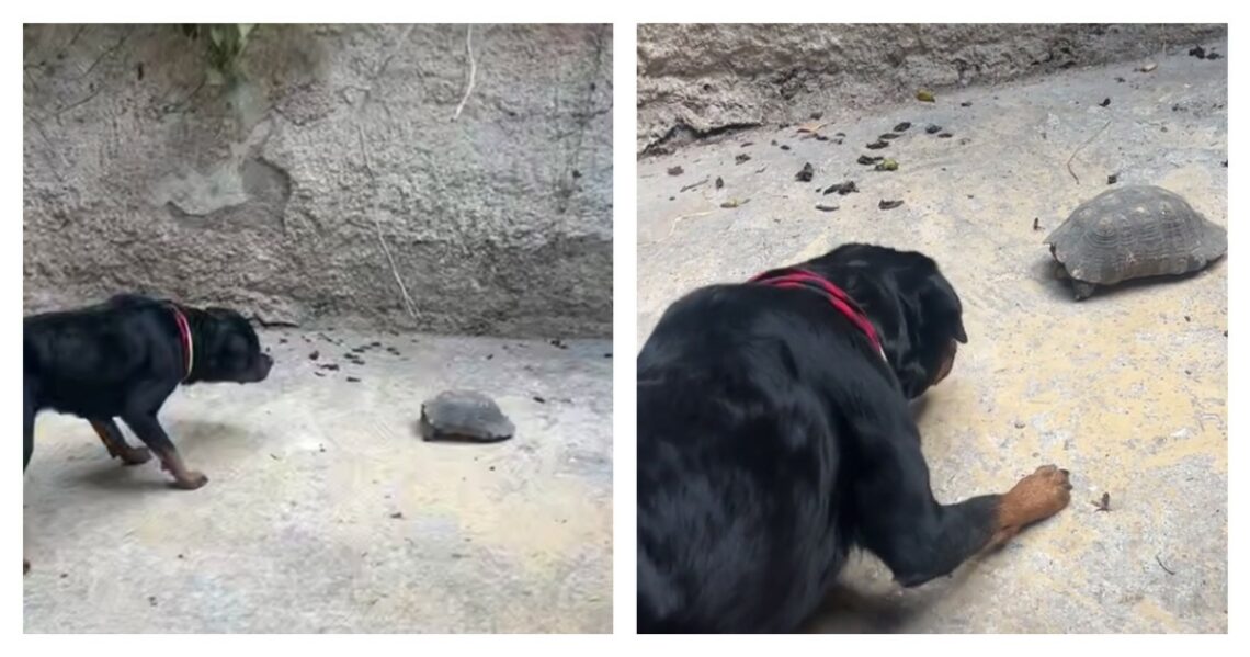 Необычная реакция собаки на черепаху