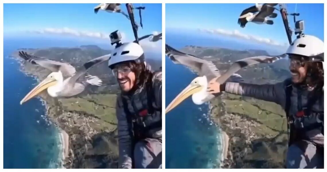 В Бразилии парапланеристу неожиданно составил компанию пеликан. Птица спокойно летела рядом, иногда подлетая совсем близко, будто проверяя нового знакомого. Получился редкий момент, когда человек и дикая птица почти синхронно движутся в потоке воздуха, словно это их общий полёт.