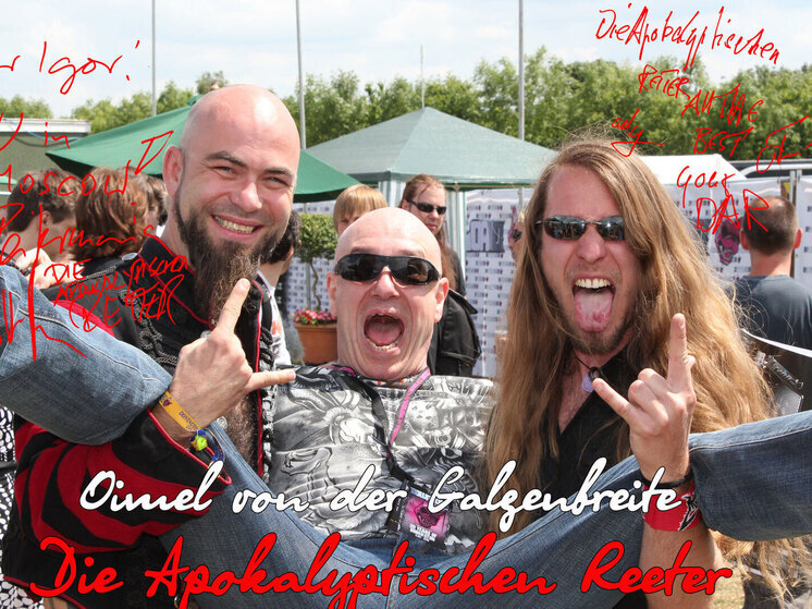 Пока мы болтали, подошел басист Volk-Man и рассказал забавную историю: когда-то, на одном из их первых концертов «Всадников» в маленьком клубе под Йеной, во время выступления у них пропало электричество. Темнота, тишина, публика замерла. И тут Фукс, не растерявшись, схватил мегафон, оказавшийся по случаю в груде реквизита, и заорал: «Апокалипсис наступил! Но мы живы и играем а капелла!» И вся толпа, не видя в кромешной тьме музыкантов, пела с ними хором почти полчаса! «После этого нас уже невозможно было выключить», — с удовольствием заключил Volk-Man.