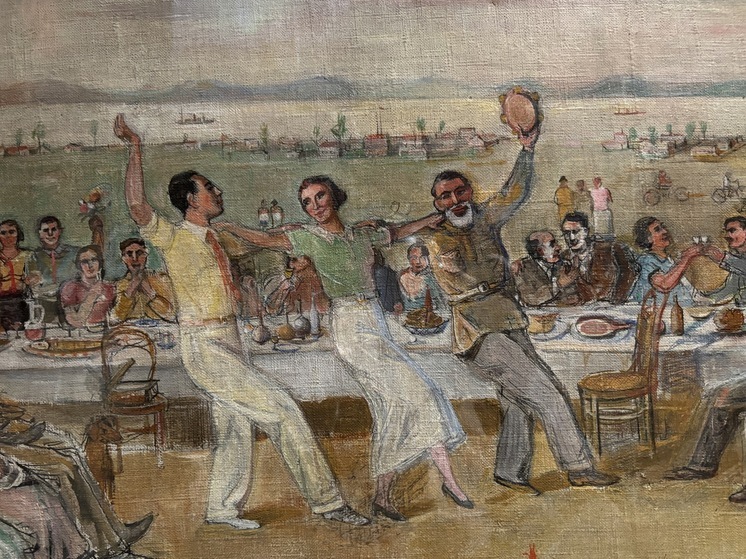 Примечательна и картина Александра Лабаса «Еврейская свадьба». Как пояснила Наталья Михалина, художник создал ее в Биробиджане, в столице молодой Еврейской автономной области, отсюда и все странности картины: нет ни традиционных нарядов, ни хупы, ничего из того, что мы видели на выставке, костюмы в соответствии с модой конца 1930-х. Хотя на столах среди угощений просматривается что-то похожее на форшмак…